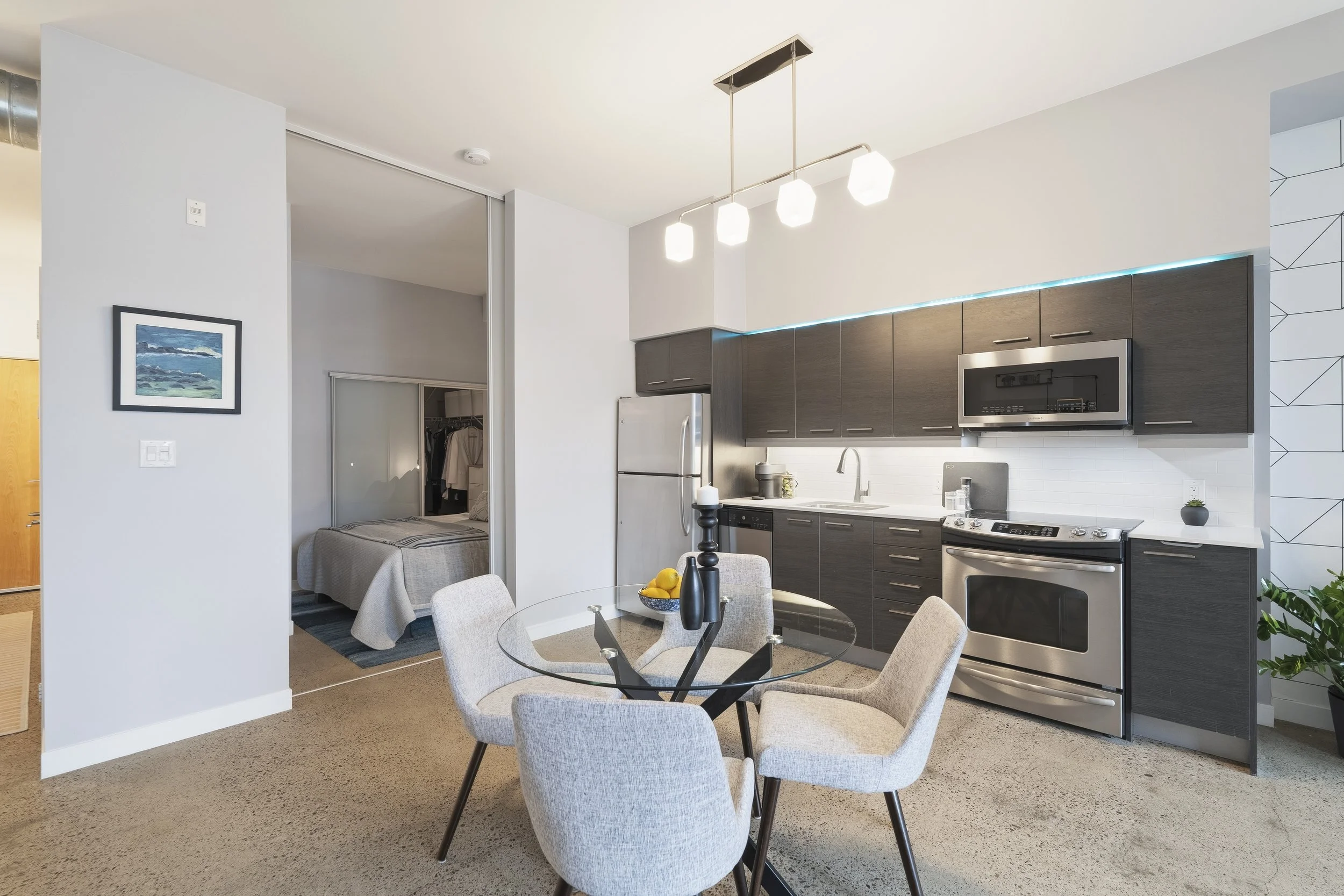 The open-concept layout maximizes flow and functionality, with a modern kitchen seamlessly connected to the living and dining areas. The well-sized bedroom includes a walk-in closet, providing both comfort and smart storage.